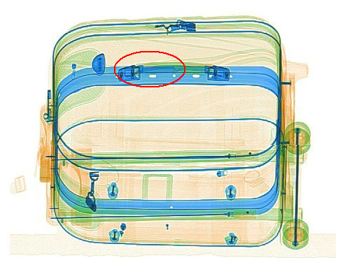 由上图可见,在第二视角中被行李箱骨架(把手处,红色椭圆内)遮挡的水果刀,可以在二视角中看到。
